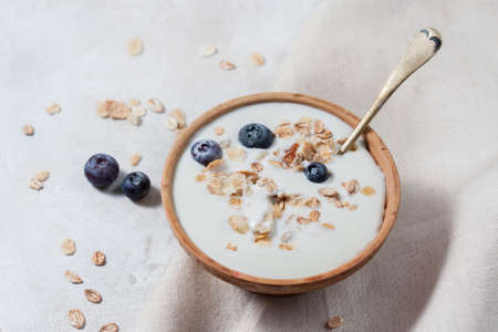 Healthy dessert with yogurt, nuts, oats and blueberries