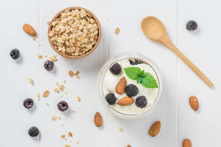 Yogurt with granola, blackberries and almonds on a white wooden table. Vegetarian food with prebiotics.