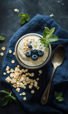 A bowl of creamy yogurt topped with fresh blueberries, crunchy granola, and mint leaves is presented on a dark fabric background. Oats are scattered around, adding texture to the display.