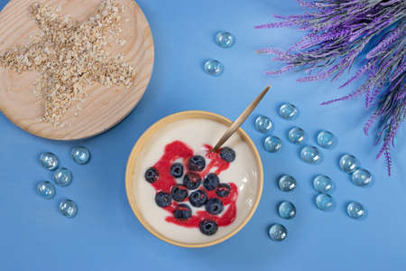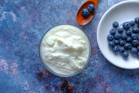Bowl with yogurt and blueberries on table. Blueberry yogurt with fresh blueberries. Healthy breakfast. Super food healthy eating vegetarian vegan food