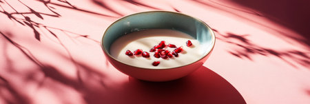 A bowl of coconut milk with pomegranate seeds sits against a pink-red backdrop. Subtle, airy shadows and soft light highlight the fresh, creamy dish, creating a serene and warm atmosphere
