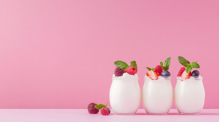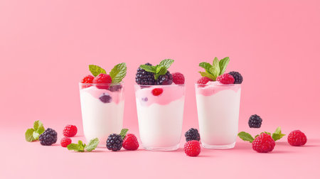 Delight in these fresh yogurt parfaits adorned with colorful berries and mint, set against a soft pink backdrop, perfect for a healthy snack or dessert.