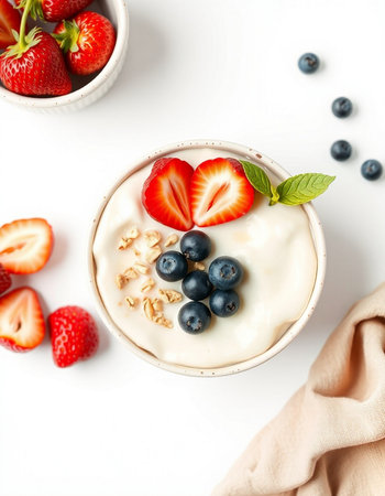 Yogurt with fresh berries on white background. Healthy breakfast.