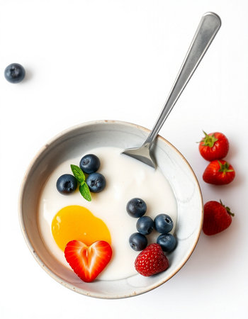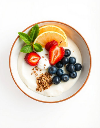 Yogurt with blueberries and strawberries in a bowl isolated on white background