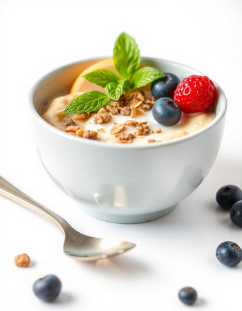 Healthy breakfast bowl with yogurt, berries and granola isolated on white background