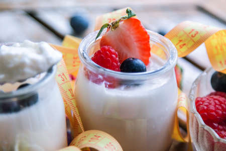 yogurt with raspberries and blueberries on wooden background with measuring tape, diet and food concept