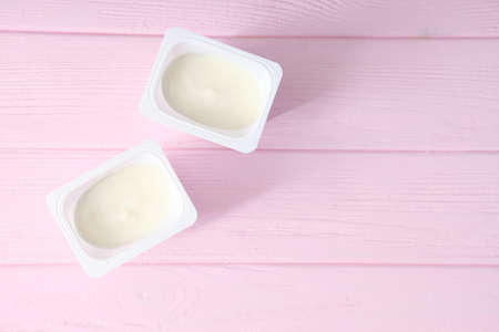 Tasty yogurt in a plastic glass on a colored table. Place to insert text.
