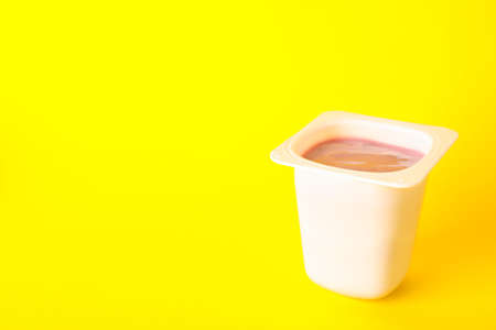 Tasty yogurt in a plastic glass on a colored table. Place to insert text.