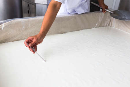 A woman working in a small family creamery is checking the right temperature with a thermometer of a cheese batch. The dairy farm is specialized in buffalo yoghurt and cheese production.