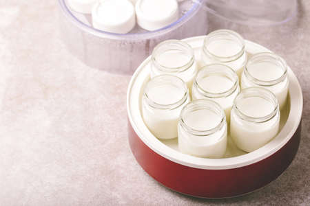 Homemade greek yogurt in glass jars and yogurt maker on gray stone background. Healthy food concept