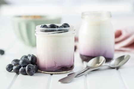 Blueberry yogurt in a jar on wooden table background. Healthy food rich in protein and calcium, weight loss product