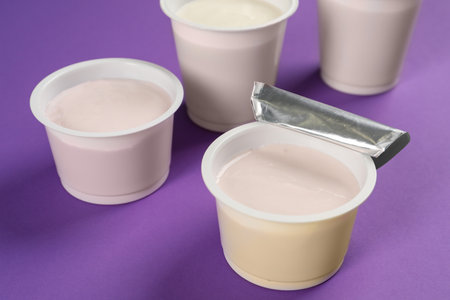 Bottles with probiotics and prebiotics dairy drink on light purple background. Bio yogurt with useful microorganisms. Production with biologically active additives. Fermentation and diet healthy food.