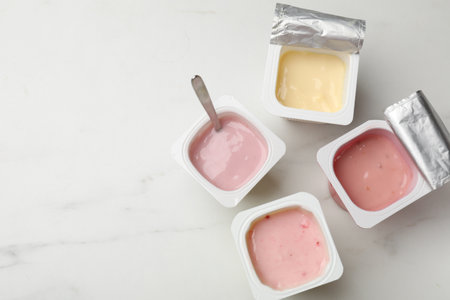 Delicious yogurts in plastic cups on white marble table, flat lay. Space for text