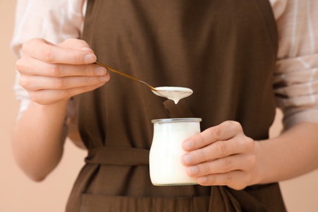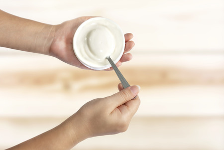 Woman holding a bowl of yogurt and spoon in hand. Yogurt made from milk fermented by added bacteria, often sweetened and flavored.