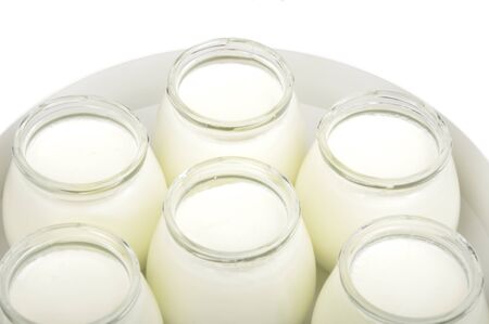Numbers of bottles from under yogurt with dark blue covers And a glass bowl with yogurt