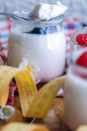 yogurt with raspberries and blueberries on wooden background with measuring tape, diet and food concept