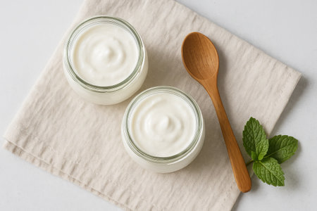 Fresh yogurt and mint leaves with wooden spoon on light fabric background. concept of healthy eating, natural ingredients, and simple food composition.