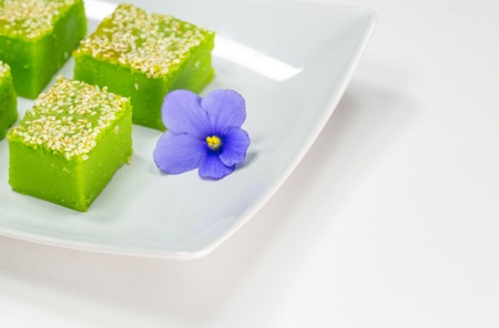 The thai style pandan steam layer cake (kanom chan) with a sheet of gold in the gold plate