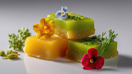 A stunning arrangement of vibrant jelly cubes in green and yellow hues, garnished with edible flowers and fresh herbs, ideal for elegant presentations.