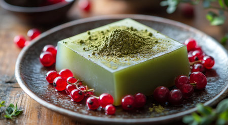 A refreshing green tea dessert sits on a rustic wooden table, adorned with vibrant raspberries and a sprinkle of matcha powder. Surrounding the delicate treat are fresh berries, adding color and a burst of flavor.