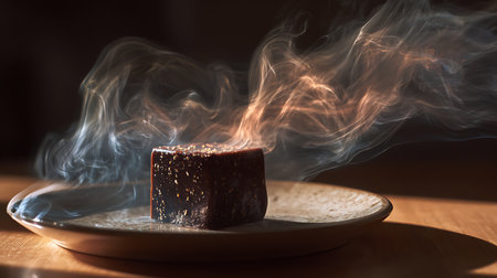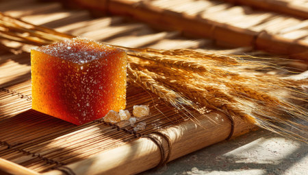 Cube of amber-colored, sugared candy sits on a wooden mat, next to a bunch of golden wheat stalks. The candy is detailed and the sugar crystals are visible on the surface. The natural light creates a warm ambiance.
