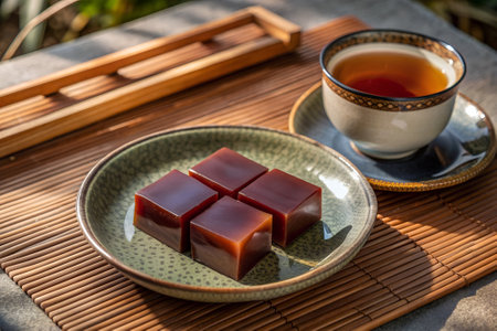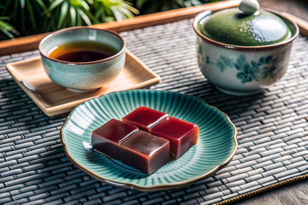 Japanese Yokan, Slices of red bean jelly set on a ceramic plate with a cup of green tea