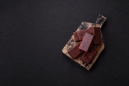 Rectangular chocolate candies with mousse and waffles on a dark concrete background