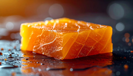 A perfect, glistening cube of fresh raw salmon rests on a dark, wet surface, illuminated by a warm light. This macro shot captures the rich texture and vibrant color, ready for a gourmet sashimi or sushi preparation, embodying the essence of luxury dining and healthy eating.