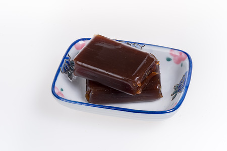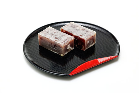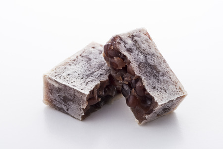 Japanese sweets Kintsuba on a plate. Kintsuba is sweetened red beans wrapped in wheat flour dough.