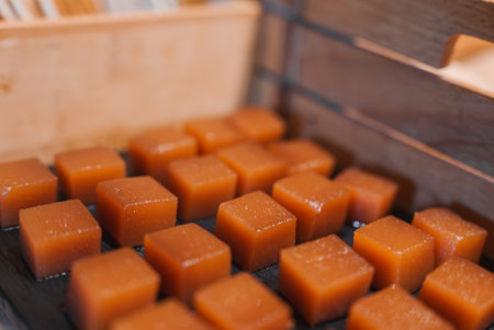Close-Up of Glossy Orange Jelly Cubes on Tray with Wooden Container Background