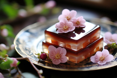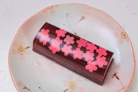 Close up shot of a cherry flower shape red bean jerry at Los Angeles, California