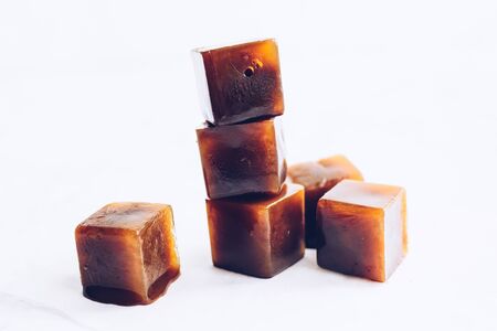 Frozen coffee cubes to prepare refreshing coffee drinks. Close up on white background.