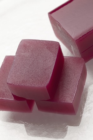 Guava jam in bar known in Brazil as Goiabada, isolated on white background, with plate and cut fruits around