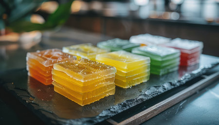 A beautiful assortment of colorful gelatin desserts arranged on an elegant plate, showcasing traditional craftsmanship and vibrant hues, ideal for food photography.