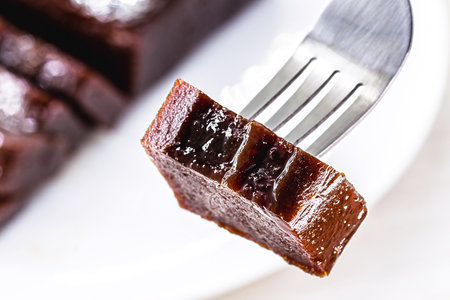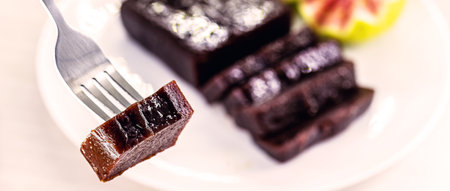 piece of guava jam on a fork. Blurred guava in the background. Space for text, sweet made from fruit, traditional of the June festivities in Brazil, rural food