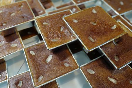 Locally known as Kuih Bakar, a Malaysian sweet delicacy with sesame seeds toppings