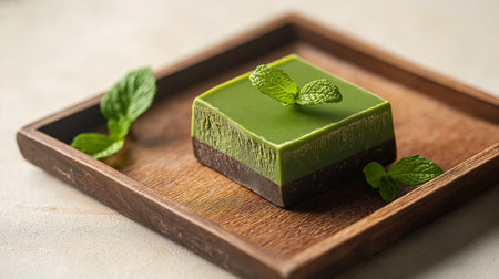High quality photo of a single square of vibrant green matcha chocolate, resting on a wooden tray with a sprig of fresh mint nearby, against a soft beige background