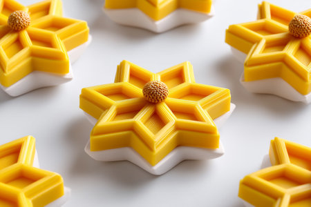 Star-shaped soap bars in bright yellow color arranged attractively on smooth white surface. Focus on unique design, ideal for beauty products, home decor, gift shops.