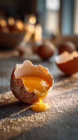 A close-up view of a cracked eggshell showcasing a vibrant yellow yolk, set on a kitchen table with cooking utensils, illuminated by soft morning sunlight.
