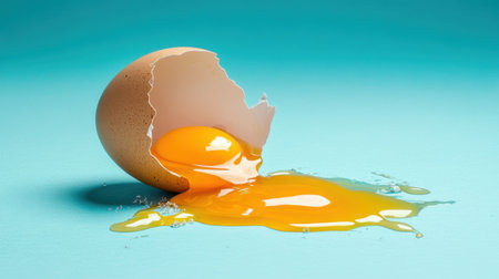 The image features a cracked eggshell with bright yellow yolk spilling onto a turquoise surface, emphasizing freshness and culinary themes suitable for food-related content.