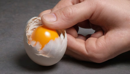 A close-up of a cracked eggshell revealing a golden yolk, symbolizing the beginning of a delicious culinary creation.