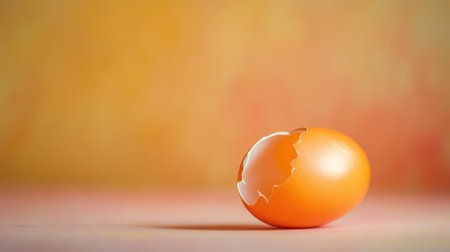A bright orange egg shell rests on a pastel surface showcasing its cracked texture against a gradient background filled with warm hues.