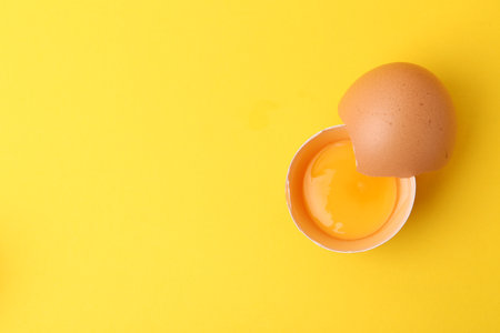 One broken chicken egg on yellow background, top view. Space for text