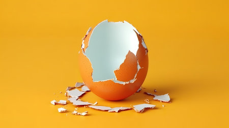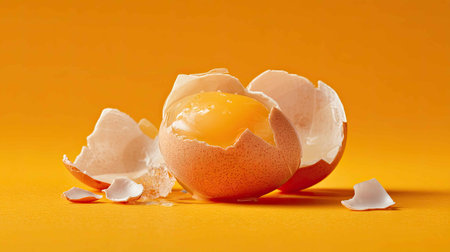 A vibrant still life featuring broken egg shells with a rich yellow yolk against a bright orange background. Perfect for food photography or culinary projects.