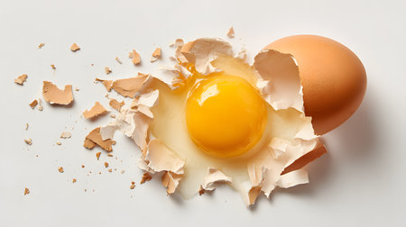 Broken egg and egg yolk close up with isolated white background, in the style of photo realistic --ar 3:2 Job ID: d2172243-9b4b-4cd8-a857-980faa4762ed