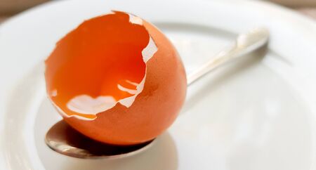 broken chicken egg in a white plate and spoon close-up. background with a broken chicken egg.