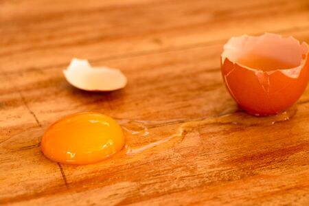 Broken egg on a wooden table in the kitchen. Food background