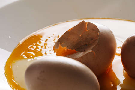 Cracked eggs on white plate with morning light. Brocken eggshell