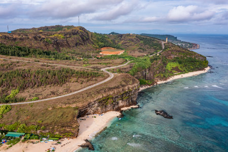 Aerial View of beautiful hill, sea level with blue sky in Dai Sekirinzan park, Okinawa, Japan