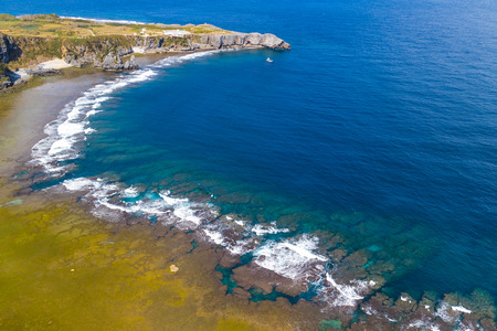 Scenic landscape with rocks, hight cliff on coastline and blue ocean. Aerial view